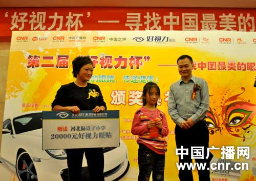 頒獎(jiǎng)儀式上,一段來(lái)自河北偏道子小學(xué)的VCR,讓現(xiàn)場(chǎng)的每一個(gè)人為之動(dòng)容。而最純凈眼睛的獲得者梁靜雨小朋友就是這樣一名貧困的學(xué)生。為了讓這雙純凈的眼睛更加充滿希望,北京好視力公司特別向河北偏道子小學(xué)捐助了價(jià)值2萬(wàn)元的眼貼,并向其本人捐助助學(xué)金。那一刻,整個(gè)現(xiàn)場(chǎng)全都是暖暖的感動(dòng)!