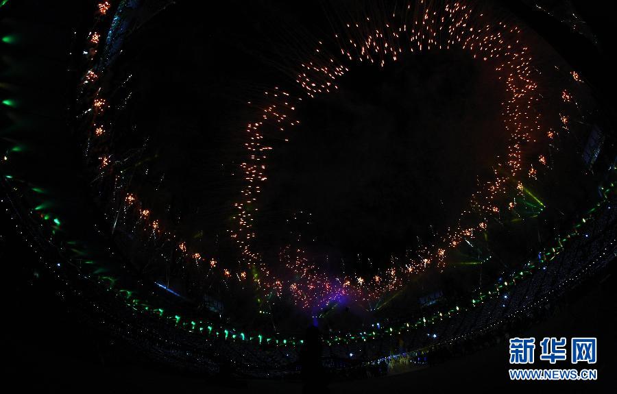 8月12日,第三十屆夏季奧林匹克運動會閉幕式在倫敦奧運會主體育場舉行。圖為閉幕式上的焰火表演。 新華社記者沈伯韓攝