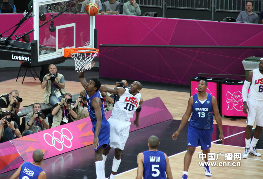 首節(jié)比賽,夢十不斷用快攻得分。首節(jié)還有6分42秒時,美國搶斷之后快速反擊,杜蘭特剛過罰球線就跳起,滑翔之后單手暴扣得分,連投帶罰拿下3分,美國以11-5領(lǐng)先。法國靠帕克組織進(jìn)攻,一點(diǎn)點(diǎn)將比分扳回。在帕克率領(lǐng)下,法國本節(jié)只以21-22落后。