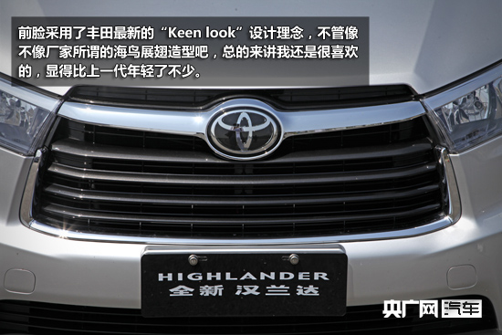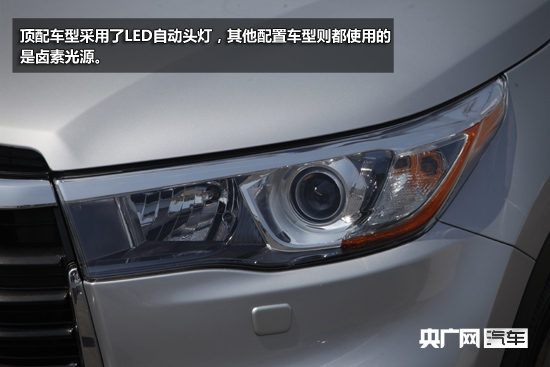 很多人管漢蘭達叫大漢,但這個大漢卻又不是粗糙的摳腳大漢,絕對是經(jīng)過精心設計的。前臉采用了豐田最新的“Keen look”設計理念,不管像不像廠家所謂的海鳥展翅造型吧,總的來講我還是很喜歡的,顯得比上一代年輕了不少。頂配車型采用了LED自動頭燈,其他配置車型則都使用的是鹵素光源。
