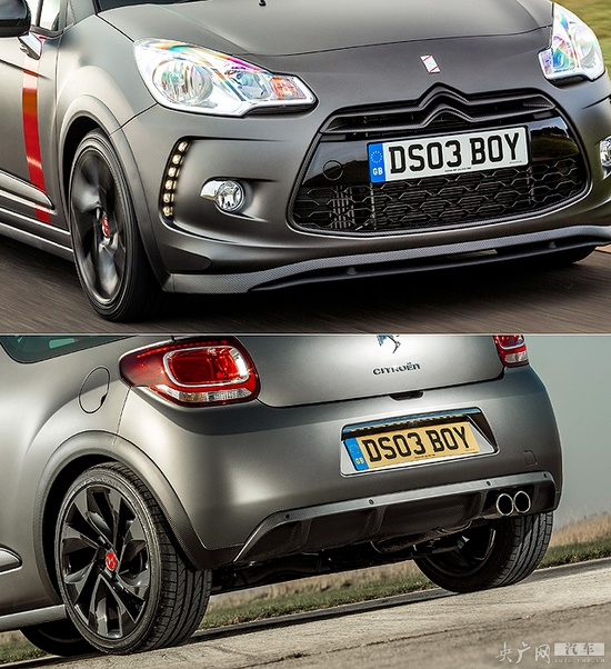DS3敞篷Racing限量版是基于雙門DS3 Racing版打造的,外觀上對比普通版,紅色條紋涂裝和磨砂漆面,而高度也降低了15mm,長度增加了30mm。18英寸的輪轂與黑色纖維車頂不但帶來更運動化的外觀,還在一定程度上增加了操控性。