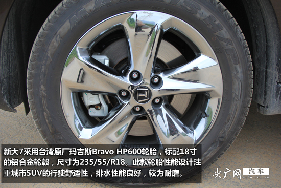 新大7采用臺灣原廠瑪吉斯Bravo HP600輪胎,出廠標(biāo)配18寸的鋁合金輪轂,輪胎尺寸為235/55/R18。此款輪胎性能設(shè)計(jì)注重城市SUV的行駛舒適性,排水性能良好,較為耐磨。