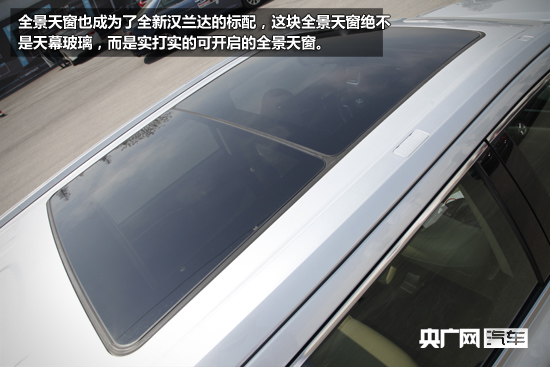 全景天窗也成為了全新漢蘭達(dá)的標(biāo)配,這塊全景天窗絕不是天幕玻璃,而是實(shí)打?qū)嵉目砷_啟的全景天窗。