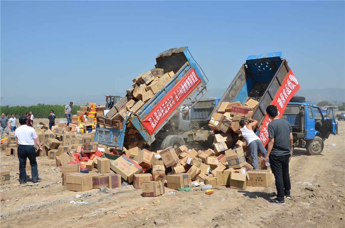 集中銷毀“三無”白酒,汾陽市食藥局集中銷毀“三無”及劣質(zhì)白酒、配制酒,共計1600余箱,貨值金額27萬余元。