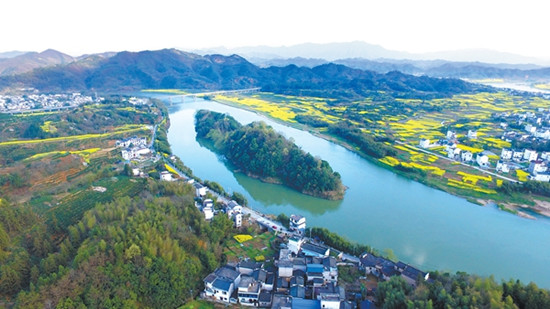 9月26日,記者來到雄村鎮(zhèn)雄村村。清澈的新安江水繞村流淌,徽派風(fēng)格的村落點(diǎn)綴在江邊,青山綠意,古樹翠竹,粉墻黛瓦,略帶滄桑的古民居、古牌坊倒映水中,儼然一幅水墨山水畫。