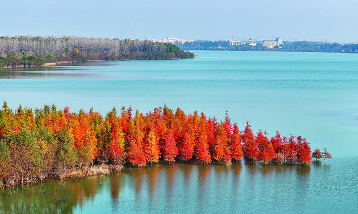 二十四節(jié)氣的小雪剛過(guò),合肥的初冬便攜著彩墨而來(lái)。逍遙津的古銀杏最是慷慨,把金黃鋪得滿地都是;董鋪水庫(kù)的池杉林正燃成“火海”,鋪紅半片水岸;天鵝湖畔的林間更是打翻了調(diào)色盤(pán),交織成錦……