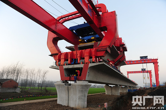 上月16日,太和縣境內(nèi),商合杭鐵路工地正在進行架梁作業(yè)。(資料圖片)