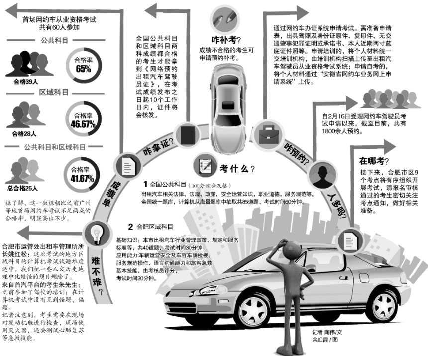 據(jù)安徽商報(bào)報(bào)道 昨日上午,合肥市首場(chǎng)網(wǎng)絡(luò)預(yù)約出租汽車(chē)駕駛員從業(yè)資格考試在合肥軍英(八一)駕校舉行,考試共分為全國(guó)公共和合肥區(qū)域兩個(gè)科目,每個(gè)科目滿分均為100分,及格分各為80分。當(dāng)天60人考試,只有25人通過(guò)考試,合格率41.67%。據(jù)了解,考試成績(jī)發(fā)布之日起10個(gè)工作日內(nèi),合肥市運(yùn)管部門(mén)會(huì)為成績(jī)合格的考生核發(fā)《網(wǎng)絡(luò)預(yù)約出租汽車(chē)駕駛員證》。沒(méi)有通過(guò)考試的考生可以申請(qǐng)預(yù)約補(bǔ)考。接下來(lái),合肥市區(qū)9個(gè)考點(diǎn)將組織開(kāi)展考試。