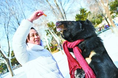 昨天,在北京野生動物園人造雪地,黑熊聰聰正和游人互動。