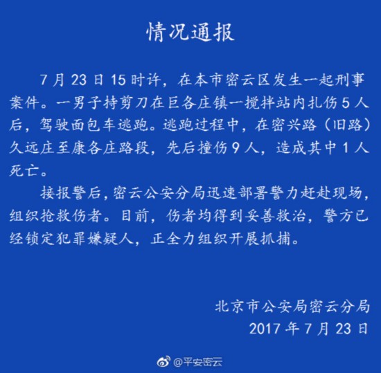 人民網(wǎng)北京7月24日電 北京市公安局密云分局官方微博23日晚通報(bào)一起刑事案件,一男子持剪刀扎傷5人后逃跑,并在駕車逃跑過(guò)程中撞傷9人,其中1人死亡。目前,警方已鎖定犯罪嫌疑人,正全力組織開(kāi)展抓捕。
