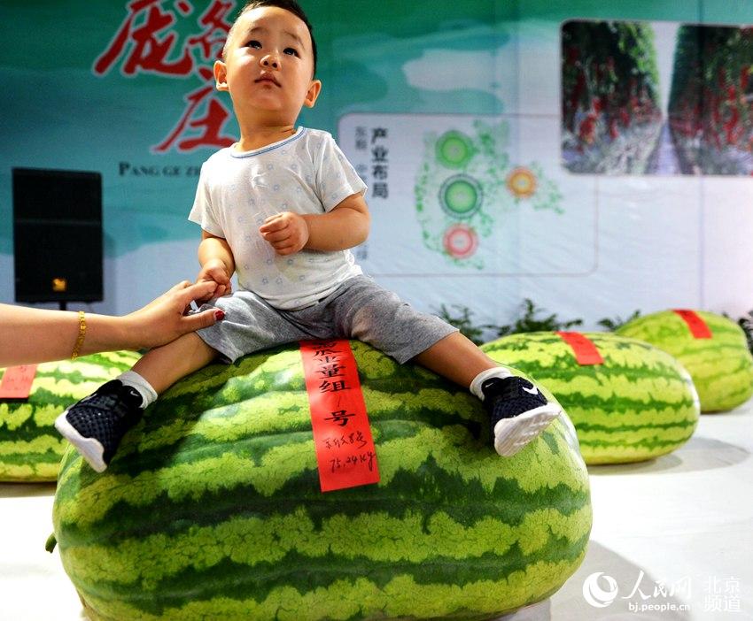 “瓜王”個(gè)頭堪比孩子。 人民網(wǎng)北京5月25日電(孟竹)“揭曉啦,75.24公斤!今年的瓜王就是它!”隨著一聲歡呼,一顆重量相當(dāng)于成年男子的西瓜“勇奪”瓜王桂冠。5月25日,一群“夏日果王”聚集在北京大興,上演了一出精彩絕倫的“宮斗”大戲——第29屆北京大興全國(guó)西甜瓜擂臺(tái)賽在龐各莊鎮(zhèn)西瓜小鎮(zhèn)舉辦,來(lái)自全國(guó)216名參賽選手帶來(lái)的上千個(gè)西甜瓜“披紅掛綠”集中亮相,接受評(píng)審們的打分,81歲瓜農(nóng)宋寶森帶來(lái)的重達(dá)150斤的西瓜在萬(wàn)眾矚目重榮登“瓜王”寶座,品種為京欣8號(hào)。 記者來(lái)到西甜瓜擂臺(tái)賽現(xiàn)場(chǎng),香甜清新的瓜香味道撲鼻而來(lái)。本屆西甜瓜擂臺(tái)賽設(shè)大型西瓜重量瓜王組、中型西瓜綜合組、小型西瓜綜合組、甜瓜綜合組、新品種獎(jiǎng)、組織獎(jiǎng)、西瓜創(chuàng)意繪畫(huà)作品組7個(gè)西甜瓜評(píng)選獎(jiǎng)項(xiàng)。值得一提的是,今年的擂臺(tái)賽設(shè)立了新品種獎(jiǎng),參加的西甜瓜新品種達(dá)30多種,這些品種都是大興區(qū)從全國(guó)西瓜科研種業(yè)機(jī)構(gòu)引進(jìn)的新品種西甜瓜。 最讓大伙兒高興的是,今年的擂臺(tái)賽引入了“互聯(lián)網(wǎng)+”新概,采取線上評(píng)選和線下活動(dòng)的方式實(shí)時(shí)互動(dòng),居民也可以參與到西甜瓜的評(píng)選中。通過(guò)線上微信進(jìn)行“我要上擂臺(tái)”活動(dòng),抽取出5名幸運(yùn)觀眾作為今年的大眾評(píng)委。“西瓜創(chuàng)意作品”活動(dòng),評(píng)選出15名西瓜創(chuàng)意作品擂臺(tái)賽當(dāng)天進(jìn)行展示投票,并對(duì)前三名進(jìn)行表彰。線下設(shè)置游戲互動(dòng)、大型主題金粉畫(huà)、西瓜大集、美食大賽等環(huán)節(jié)。 本屆擂臺(tái)賽還專門做了一套創(chuàng)新評(píng)分系統(tǒng),每位評(píng)委手持平板ipad,在對(duì)西瓜進(jìn)行多方面考察的同時(shí)進(jìn)行打分,打分?jǐn)?shù)據(jù)將實(shí)時(shí)傳入系統(tǒng),后臺(tái)自動(dòng)進(jìn)行收集整理,當(dāng)評(píng)委對(duì)所有瓜品打分完畢的同時(shí),參賽選手的得分成績(jī)也會(huì)馬上計(jì)算完畢。而在含糖量的比拼環(huán)節(jié),更增加了多臺(tái)速度更快、數(shù)據(jù)測(cè)算更加精準(zhǔn)的儀器,在保證比賽數(shù)據(jù)準(zhǔn)確的同時(shí),也更有效的節(jié)省了現(xiàn)場(chǎng)打分的速度。另外,場(chǎng)內(nèi)設(shè)置的休息區(qū),還可以直接通過(guò)液晶屏幕滾動(dòng)直播評(píng)選情況,進(jìn)一步保證了比賽的公開(kāi)和公正。 據(jù)龐各莊鎮(zhèn)負(fù)責(zé)人介紹,目前,全鎮(zhèn)現(xiàn)有西甜瓜種植面積3萬(wàn)畝,其中設(shè)施西瓜種植面積2.3萬(wàn)畝,年產(chǎn)量達(dá)1.1億公斤。今年,大興區(qū)已推廣早熟佳園、L900、亞洲蜜等西甜瓜品種1200多畝,即將上市,京城的老百姓有口福啦! -