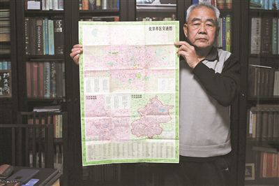 北平解放時(shí)的第一張地圖《最新北平大地圖》、1950年的《中華人民共和國(guó)大地圖》《亞洲人民反帝斗爭(zhēng)圖》……北京收藏家協(xié)會(huì)常務(wù)理事、70多歲的魏有華老人書(shū)房的墻面,幾乎被裝著鏡框的老地圖填滿(mǎn)。為便于讀圖,魏老將一張正方形餐桌改造成閱圖平臺(tái),臺(tái)面上是厚厚的幾摞老地圖。自1981年從地?cái)偵匣?毛錢(qián)買(mǎi)下的1971年《北京交通圖》開(kāi)始,至今魏老已收藏地圖3000余件套。接受北青報(bào)記者采訪前,他將一張有40年歷史的《北京市區(qū)交通圖》放在了最上層。