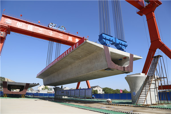 5月12日,中鐵二十二局集團建設者駕駛兩臺提梁機,把首片千噸箱梁架設在南沿江城際鐵路跨疏港特大橋上(央廣網發(fā) 侯欽佩 攝)
