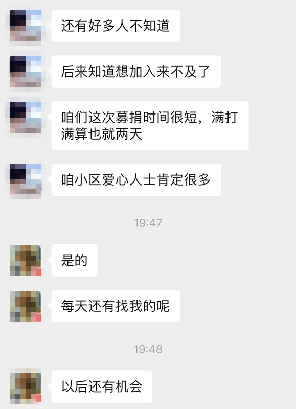 那天夜里接近零點(diǎn),正準(zhǔn)備洗漱,群里有鄰居發(fā)消息:為了感謝這些為住戶們提供服務(wù)的第三方保安,大家又建了一個(gè)群,自發(fā)給他們捐贈(zèng)一些食品和生活用品。我也入群了。大家喊群主“金子”!敖鹱印闭f:“我家有一次定了些菜,商家沒把我家的綁在一起,分了三袋,卸車的時(shí)候分散了,咱們小區(qū)2800多戶,一個(gè)人的訂單,分三次送,工作量得多大!每次送到家敲門,他說您看一下是不是還缺別的,如果缺,我們?cè)賻湍纯础H思覓甑氖枪べY,但是人家這么努力的來幫咱們。最初的意愿是打算給送菜的小哥們捐點(diǎn)東西,確實(shí)挺辛苦。我發(fā)完群二維碼以后,發(fā)到幾個(gè)業(yè)主群里面,參與的人比較多,也有鄰居提議居委會(huì)、物業(yè)也挺辛苦的,后來好多人也都支持!