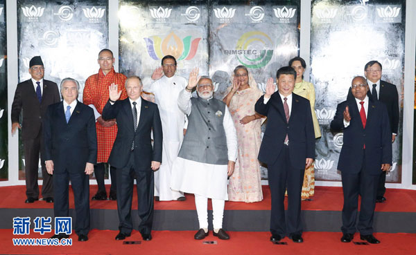 10月16日,金磚國家領(lǐng)導(dǎo)人同“環(huán)孟加拉灣多領(lǐng)域經(jīng)濟(jì)技術(shù)合作倡議”成員國領(lǐng)導(dǎo)人對話會在印度果阿舉行。國家主席習(xí)近平同印度總理莫迪、南非總統(tǒng)祖馬、巴西總統(tǒng)特梅爾、俄羅斯總統(tǒng)普京以及斯里蘭卡總統(tǒng)西里塞納、孟加拉國總理哈西娜、不丹首相托杰、尼泊爾總理普拉昌達(dá)、緬甸國務(wù)資政昂山素季、泰國政府代表等共同出席。這是與會領(lǐng)導(dǎo)人合影。新華社記者姚大偉攝