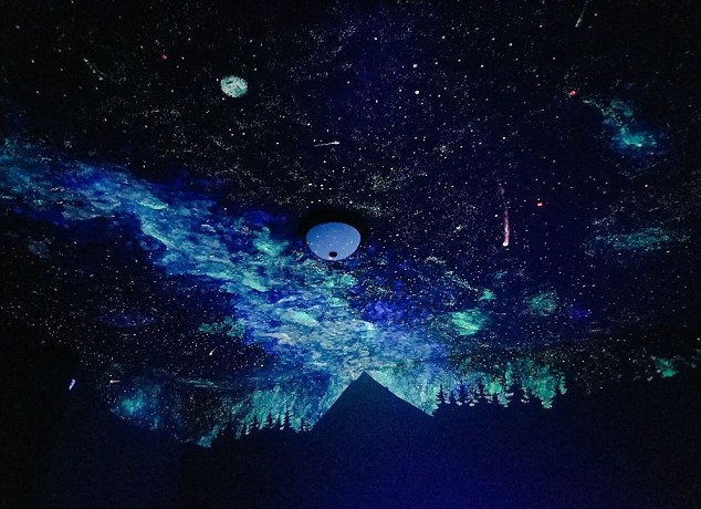 克里斯平說:“繪制墻面的油漆在白天看不見,只能在黑暗中發(fā)光,所以我只能在微暗的房間里,踩在結(jié)實的梯子上伴著音樂繪畫。”她還做了針葉林模板,用藍色膠帶貼在天花板下方。當燈光熄滅的時候,一抬頭就能看見璀璨的星空。