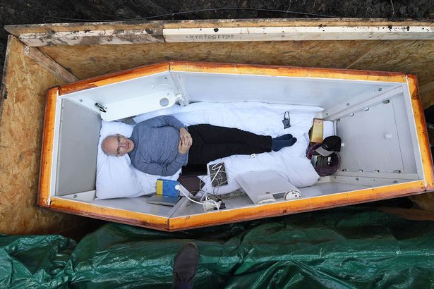 他花了3天的時(shí)間在貝爾法斯特的一座教堂外挖了一個(gè)深坑,并將一口巨大的棺材放入其中。棺材留有通風(fēng)口,其內(nèi)還放置了一盞臺(tái)燈、一臺(tái)筆記本電腦以及電源和網(wǎng)線,以便他能夠在棺材里上網(wǎng)進(jìn)行免費(fèi)在線直播。