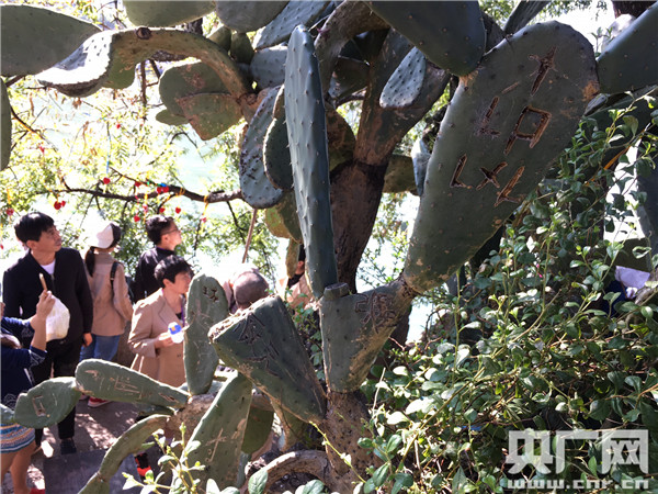 小普陀島上,有人在郁金香仙人掌的掌面上,刻著各種字符