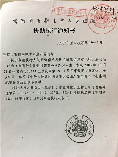 同一處房產(chǎn)出現(xiàn)兩本房產(chǎn)證,這讓王鳳和覺得不可思議。后來,在與五指山市房管局交涉中,王鳳和了解到,五指山金手指房本,也是2007年拍賣得來,并且經(jīng)過海南省一中院2002年作出的生效裁定書認定:“海南中院有個裁定書,上面裁給信達公司,信達公司委托拍賣給海南金手指。”