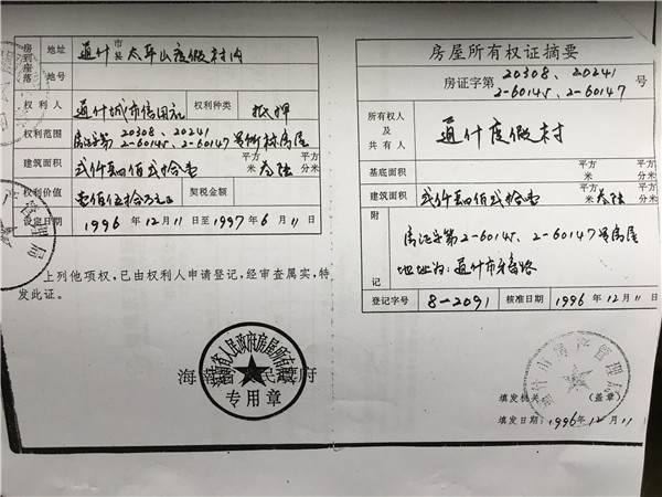 1996年12月11號,由五指山房管局頒發(fā)的他項權利證,其中“房證字第20308、20241號”,正是237.9平米的大會議室與322平米的洗衣房。
