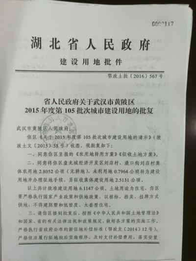 記者調(diào)查發(fā)現(xiàn),雖然案涉地塊2016才被湖北省政府批復(fù),由農(nóng)用地變更土地性質(zhì)為建設(shè)用地,但早在2002年,當(dāng)?shù)卣蛯⑦@塊土地交由武漢六建開發(fā),并讓武漢六建完成了“三通一平”(指基本建設(shè)項(xiàng)目開工的前提條件)和繳納了征地補(bǔ)償費(fèi)用。盤龍城經(jīng)開區(qū)管委會副主任胡莉萍解釋稱,當(dāng)時他們在履行這個協(xié)議,里面涉及到征地這一塊的工作,要與農(nóng)民對接,他們協(xié)助他做相關(guān)的工作。按照國家的相關(guān)政策,土地是要進(jìn)行補(bǔ)償?shù)摹?/p>