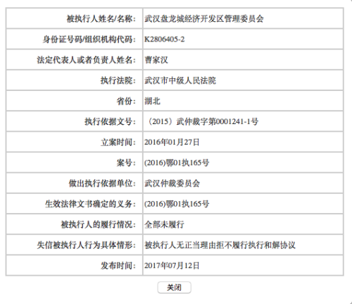 湖北省委巡視組已經(jīng)介入此案的執(zhí)行。2017年7月12日,武漢市中院就將盤龍城經(jīng)開區(qū)管委會和其法人代表曹家漢列入失信被執(zhí)行人名單。武漢市中院方面表示,不排除刑拘曹家漢的可能。一位法律界人士指出,法院仍有限制被執(zhí)行人高消費(fèi)、拘留法定代表人和直接責(zé)任人,以及按照拒不執(zhí)行法院判決裁定罪問責(zé)等強(qiáng)制措施沒有實(shí)施。