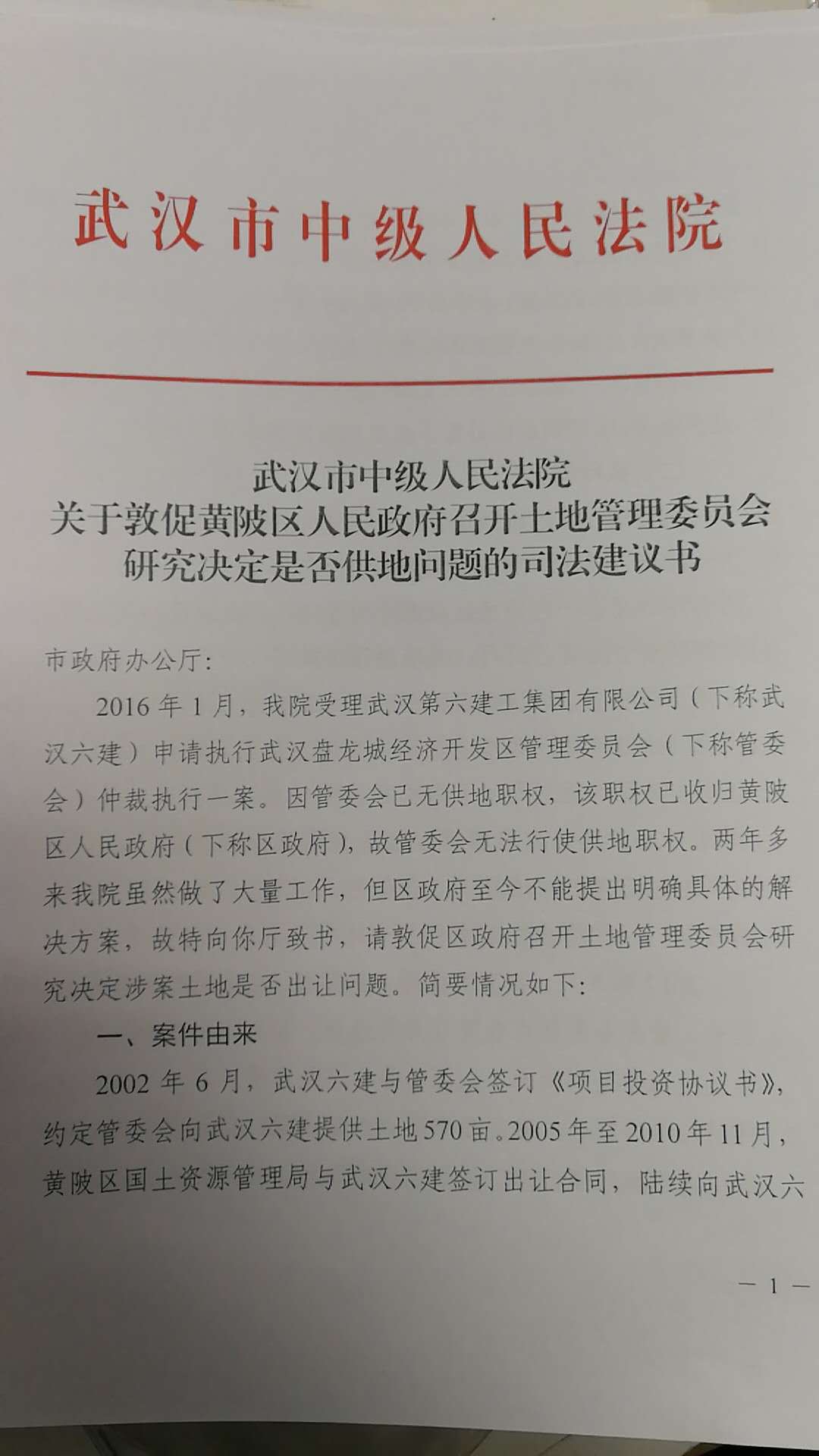 黃陂灄口經(jīng)濟(jì)發(fā)展區(qū)2003年更名為武漢盤龍城經(jīng)濟(jì)開發(fā)區(qū),黃陂第六建筑有限公司后來也更名為武漢第六建工集團(tuán)有限公司。協(xié)議約定的是出讓400畝,但到2010年,政府只為其辦理了200多畝的土地和規(guī)劃手續(xù)。雙方出現(xiàn)供地糾紛,按照協(xié)議約定,提請武漢仲裁委員會仲裁。2015年12月,武漢六建打贏了官司,但遭遇執(zhí)行難。目前,武漢市中院已三次發(fā)出敦促履行的通知書,最高法院也督辦兩次,武漢市委政法委也召開了專題會議,要求黃陂區(qū)政府盡快依法行政,但黃陂區(qū)政府仍未履行生效裁定。黃陂區(qū)政府主管副區(qū)長丁朝輝稱,中國之聲的報道播出后,區(qū)里第一時間開了專題會議。黃陂區(qū)委區(qū)政府非常重視,書記和區(qū)長都親自參加了專題會議。區(qū)政府的相關(guān)負(fù)責(zé)人和盤龍城開發(fā)區(qū)的主要負(fù)責(zé)人約見了六建公司的法人代表,雙方進(jìn)行了坦誠和務(wù)實(shí)地交流。
