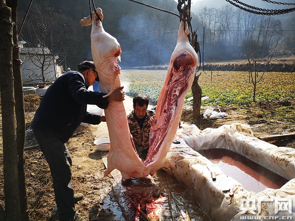 燙豬、刮毛……各項工序按慣例依次完成。收拾了這頭年豬,楊軍軍一家能過個“肥年”,去年,他養(yǎng)豬收入近十萬元。殺豬的動靜引來了不少鄉(xiāng)鄰,他們紛紛圍著楊軍軍“拉呱”起來。