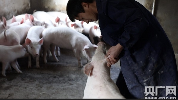 楊軍軍一入豬圈,豬仔們都湊過來(中央廣播電視總臺央廣記者 王妍 攝)