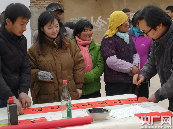 趕上秦州區(qū)組織書法家?guī)袜l(xiāng)親們寫春聯(lián),楊軍軍選了一副“脫貧攻堅奔小康 歡歡喜喜過大年”的春聯(lián)(中央廣播電視總臺央廣記者 孟永輝 攝)