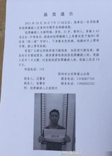 根據(jù)深圳市公安局南山分局的通報,30號下午,犯罪嫌疑人被深圳警方帶到博羅縣指認(rèn)丟棄作案工具現(xiàn)場的時候,趁機(jī)跳車逃入山里面。警方對這名犯罪嫌疑人的描述是,男性,21歲,貴州人,身高1.65米,中等體態(tài),逃脫時身穿灰色T恤和灰色長褲,背后印有“深二看”三個字。
