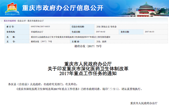 (記者 黃宇)13日,重慶市政府網(wǎng)公布了《重慶市人民政府辦公廳關(guān)于印發(fā)重慶市深化醫(yī)藥衛(wèi)生體制改革2017年重點工作任務(wù)的通知》(以下簡稱《通知》),明確了全面推進公立醫(yī)院綜合改革的時間和范圍,要求在2017年8月底前,所有公立醫(yī)院啟動改革,全面取消藥品加成(中藥飲片除外),建立公立醫(yī)院由服務(wù)收費和政府補助兩個渠道補償?shù)男聶C制,推動新舊運行機制平穩(wěn)轉(zhuǎn)換。