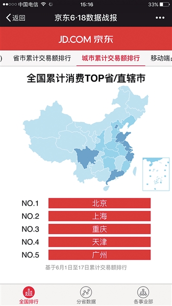 截至昨天下午3點,京東宣布在始于6月1日的京東6·18全民年中購物節(jié)期間,京東商城累計下單金額已超1100億元。而重慶在累計銷售額榜上,排名全國第三,僅次于北京、上海。同時,在這場網(wǎng)購盛宴上,更多的重慶造、重慶產(chǎn)通過京東走出重慶,走出國門。