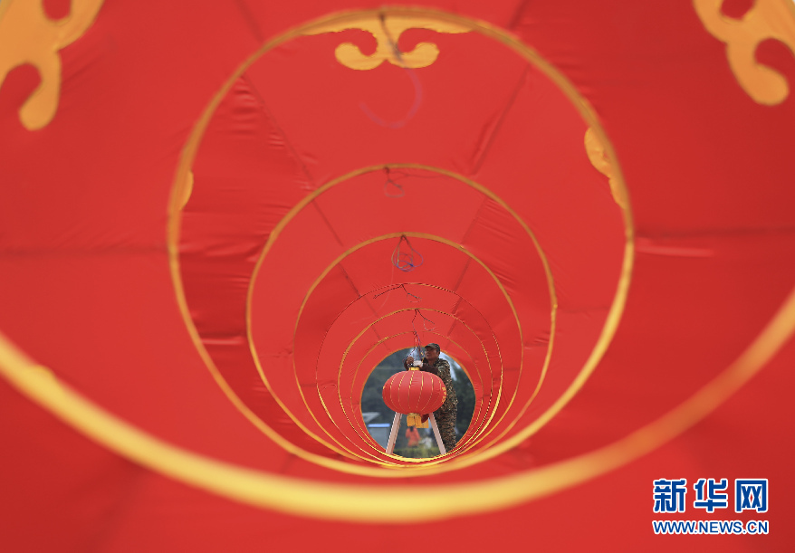 每到過年,重慶的大街小巷都會(huì)掛上火紅的燈籠以及五彩繽紛的裝飾,給新年帶來歡樂喜慶的氛圍。但是,在重慶迎春燈飾的背后,卻是燈匠工人辛勤的付出。因?yàn)樗麄,市民才能欣賞到這難得的新年美景。圖為工人師傅在重慶市北碚區(qū)縉云廣場(chǎng)安裝燈籠。新華網(wǎng)發(fā) (秦廷富攝)