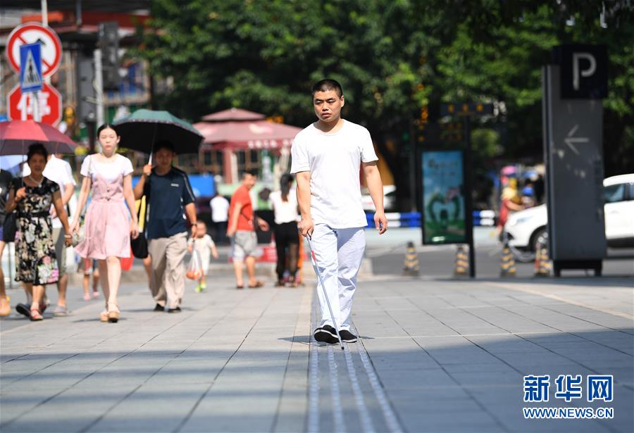 8月1日,一名盲人行走在重慶市江北區(qū)鷂子丘路一商圈附近的不銹鋼盲道上 新華社記者王全超 攝