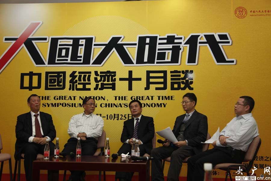 10月16日,由經(jīng)濟(jì)之聲、央廣網(wǎng)主辦的《大國(guó)大時(shí)代----中國(guó)經(jīng)濟(jì)十月談》系列時(shí)事報(bào)告會(huì)之四“價(jià)格談”,在人民大學(xué)舉行。圖為圖為國(guó)務(wù)院參事室特約研究員姚景源、國(guó)家信息中心首席經(jīng)濟(jì)師范劍平、國(guó)家發(fā)改委價(jià)格司副司長(zhǎng)周望軍、中國(guó)人民大學(xué)財(cái)政金融學(xué)院副院長(zhǎng)趙錫軍、經(jīng)濟(jì)之聲觀察員陳愛海(由左至右排序)(央廣網(wǎng) 趙娜娜/攝)