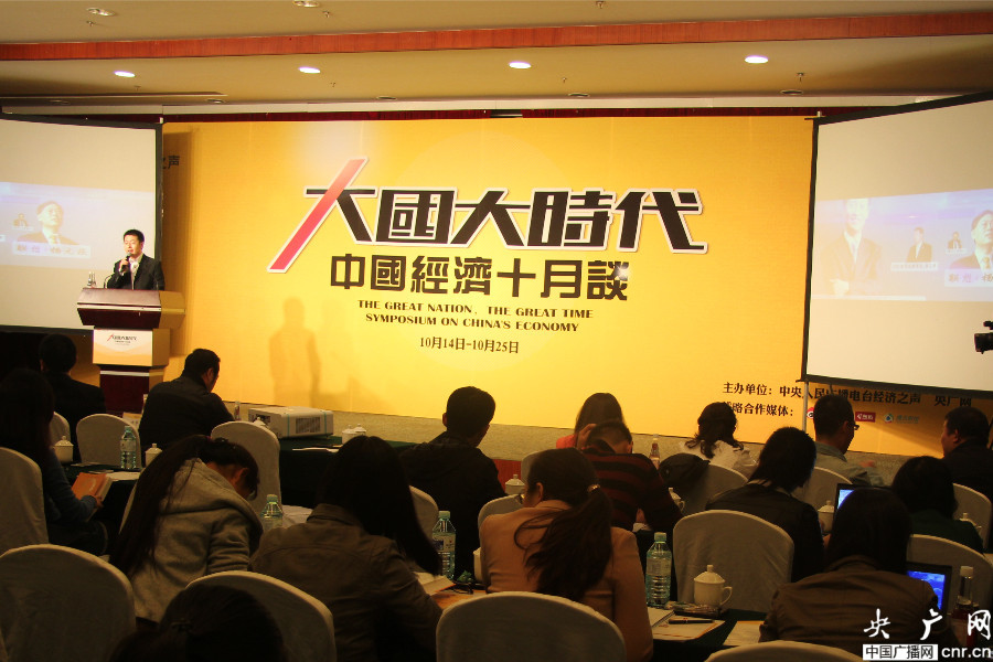 10月22日,由中央人民廣播電臺經(jīng)濟(jì)之聲、央廣網(wǎng)主辦的《大國大時(shí)代----中國經(jīng)濟(jì)十月談》系列時(shí)事報(bào)告會之六“農(nóng)村談”,在廣電國際酒店舉行。今天的主題是《農(nóng)村談:農(nóng)民與土地是歷史性地說再見了嗎?》。圖為報(bào)告會現(xiàn)場(央廣網(wǎng) 于琦/攝)