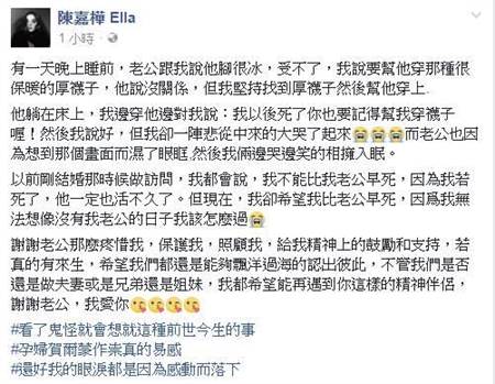 Ella透露某天睡前,老公跟她說腳很冰,她本想幫他穿上保暖厚襪子,但對方卻說沒關(guān)系,不過她還是堅(jiān)持找到厚襪子幫他穿上,過程中賴斯翔說“我以后死了你也要記得幫我穿襪子哦”,沒想到她卻一陣悲從中來的大哭起來,連老公也因想到畫面而濕了眼眶,兩人最后邊哭邊笑的相擁入眠。