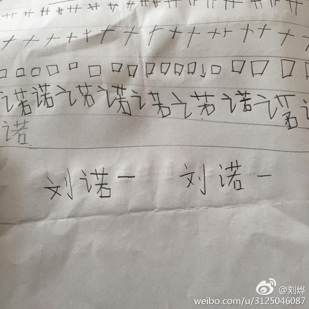 2月8日晚,劉燁[微博]更新微博曬教劉燁練字的照片,并寫道:“在家指導(dǎo)孩子練字,從名字開始,小諾進(jìn)步挺快的,但還是控制不好力道,我讓他寫了遍名字,我再寫一遍讓他看看差距!闭掌锌闯,諾一寫的是自己的名字,一次比一次寫得好,進(jìn)步很大,居然趕上爸爸劉燁的字跡了,非常的有天賦聰明。