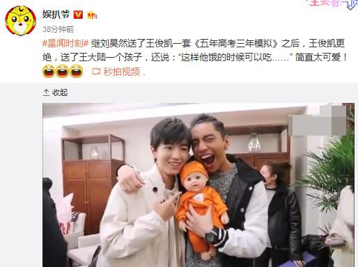 2月21日,據(jù)博主“娛扒爺”爆料,王俊凱近日碰到王大陸,一見面,他就送了王大陸一個“孩子”——當(dāng)然是個公仔娃娃啦,然后還調(diào)侃說王大陸?zhàn)I了可以吃。