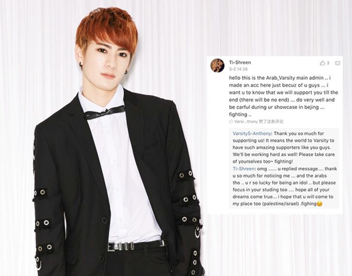 在微博中,海外粉絲表示自己是VARSITY-V組合阿拉伯地區(qū)粉絲站的負責(zé)人,特地為了VARSITY-V組合注冊了微博賬號,希望表達自己對組合的支持,也希望團隊成員能夠表現(xiàn)越來越好,注意身體,并且期待VARSITY-V在北京的舞臺表演。暖心的安東尼在微博用英文回復(fù)了粉絲的關(guān)心,讓粉絲十分驚喜。