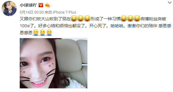 在微博粉絲突破百萬的當天,球球深夜發(fā)微博感謝粉絲一路的陪伴,表示與粉絲侃大山已經(jīng)成為了一種習慣,言語中透露著粉絲破百萬的喜悅和感恩。