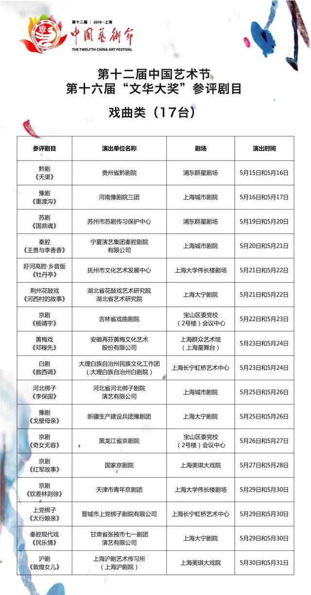 近日,參加第十二屆中國藝術(shù)節(jié)的51臺劇目演出日程正式公布。其中,經(jīng)過全國各。▍^(qū)、市)、新疆生產(chǎn)建設(shè)兵團、中央軍委政治工作部推薦的38臺劇目入圍了第十六屆“文華大獎”的評選。值得一提的是,經(jīng)過業(yè)界專家、協(xié)會以及港澳臺地區(qū)推薦的13臺劇目也將在本屆藝術(shù)節(jié)集中亮相參演,為廣大觀眾帶來精彩紛呈的演出。