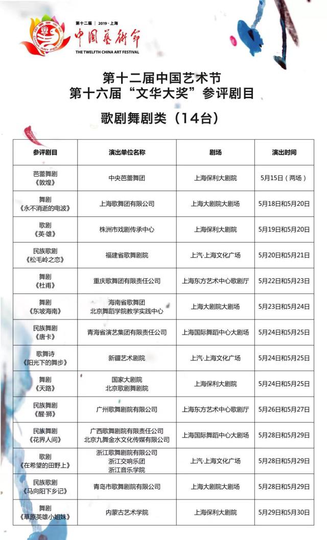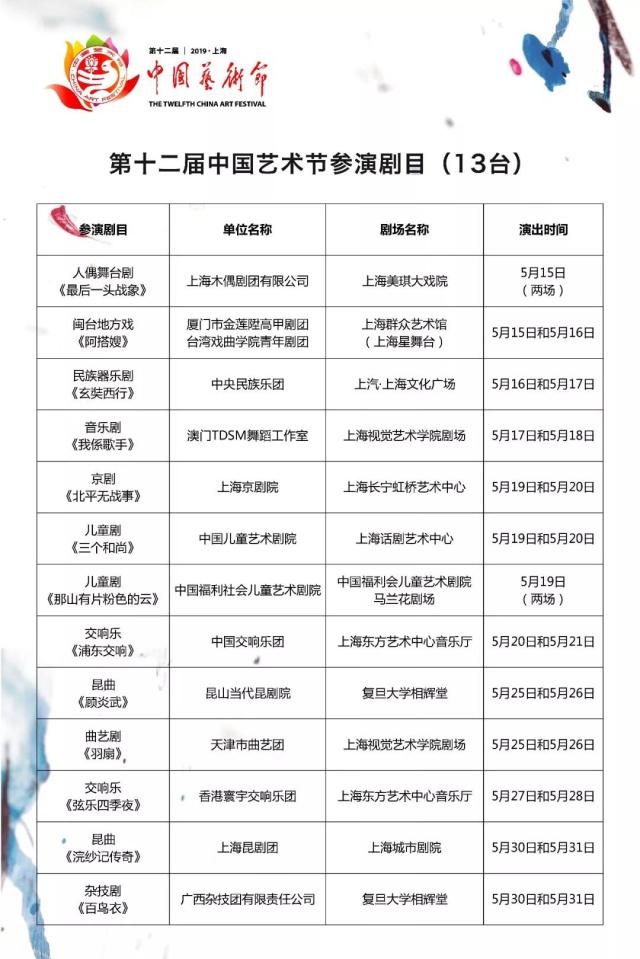 第十二屆中國藝術(shù)節(jié)51臺演出劇目日程公布啦,近日,參加第十二屆中國藝術(shù)節(jié)的51臺劇目演出日程正式公布。值得一提的是,經(jīng)過業(yè)界專家、協(xié)會以及港澳臺地區(qū)推薦的13臺劇目也將在本屆藝術(shù)節(jié)集中亮相參演,為廣大觀眾帶來精彩紛呈的演出。