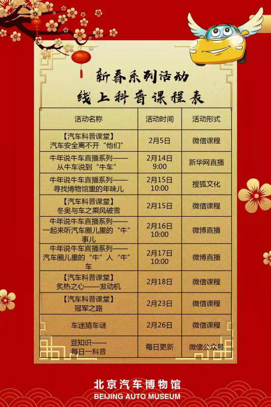 除了線上精彩紛呈的年味活動,線下活動也別出心裁。針對疫情防控情況,汽車博物館將采取限量、預(yù)約、錯(cuò)峰入館等措施,除夕至初二(2021.2.11—2021.2.13)閉館,初三至初六(2021.2.14—2021.2.17)正常開放,開放時(shí)間為9:00-17:00。觀眾可在“北京汽車博物館微信公眾號”進(jìn)行預(yù)約參觀,初三至初六每天進(jìn)館前10名的觀眾可以領(lǐng)取新年福袋一個(gè)。