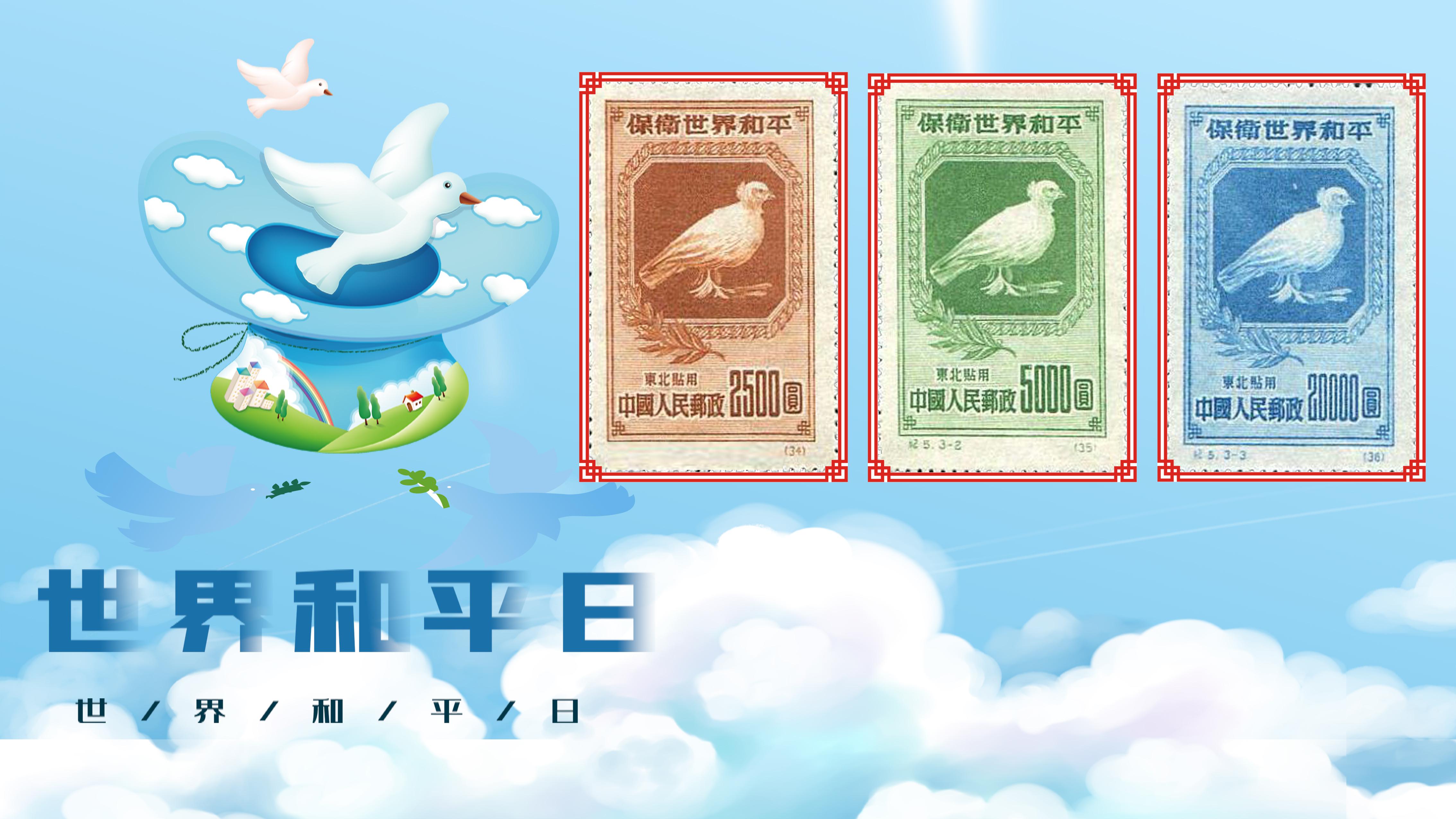 郵票分為舊人民幣值和東北幣值兩組,各3枚,顏色不同,分別為赭石色、草綠色、淡藍(lán)色;圖案均相同,采用了西班牙畫(huà)家畢加索為第一屆世界保衛(wèi)和平大會(huì)所繪的一幅和平鴿。