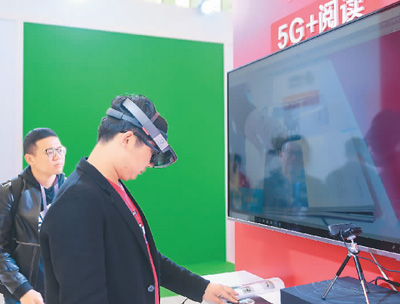 觀眾在數(shù)字閱讀發(fā)展與技術(shù)博覽會上體驗(yàn)5G+閱讀!⌒氯A社記者 黃宗治攝