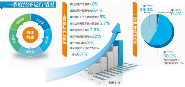 地區(qū)生產總值快速增長,經濟結構轉型升級。數據顯示,一季度GDP增速較去年同期提高0.5個百分點,增幅比1-2月提高1.2個百分點,經濟三次產業(yè)結構為0.4∶39.4∶60.2,第三產業(yè)占比超過60%,對GDP的增長貢獻率達到55.6%。工業(yè)成色不斷刷新,規(guī)上高新技術產業(yè)在規(guī)上工業(yè)中的占比高達67.1%!盎ヂ(lián)網+零售”增長33.0%,網上零售額占限上社會消費品零售額的29.1%。信息傳輸、軟件和信息技術服務業(yè)等重點服務業(yè)快速成長——新產業(yè)、新業(yè)態(tài)、新模式不斷壯大,經濟結構更趨優(yōu)化。