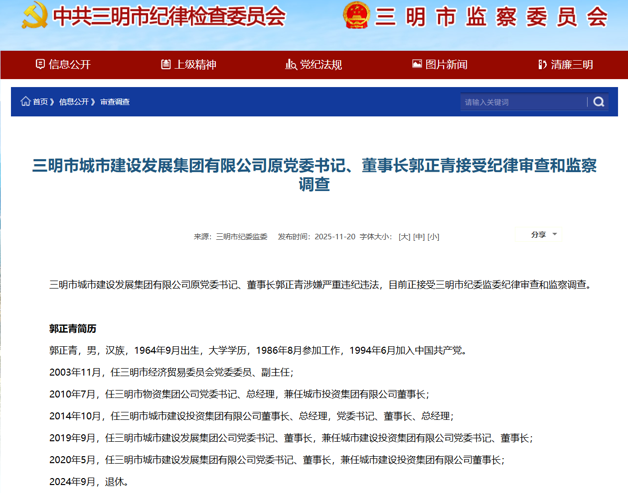 央廣網三明11月21日消息(記者羅曉英)11月20日,三明市紀委監(jiān)委官網發(fā)布,三明市城市建設發(fā)展集團有限公司原黨委書記、董事長郭正青涉嫌嚴重違紀違法,目前正接受三明市紀委監(jiān)委紀律審查和監(jiān)察調查。