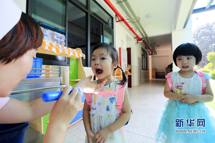 開(kāi)園第一天的晨檢,讓小朋友有些意外。但這更像一個(gè)儀式,其意義在于幫助孩子們養(yǎng)成健康、衛(wèi)生的生活習(xí)慣。新華網(wǎng) 肖和勇 攝 -
